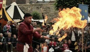 Les siècles médiévaux ont fort goûté les fêtes. De la taverne au château, dans la rue, au marché, on rit, on boit, on se rassemble autour des bateleurs venus par les chemins amuser seigneurs et gens du peuple.